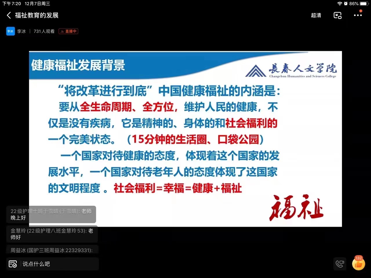 刘玉锦介绍了“健康中国”与福祉产业未来发展的新格局,讲解了全生命周期、全方位的社会化服务理念,并通过世界技能大赛选手及专升本优秀学生的事迹和案例,激励同学们要努力学习专业知识,积极参加技能竞赛,不断提升自我,成为社会所需的技术技能型人才,助力成就自己的精彩人生。