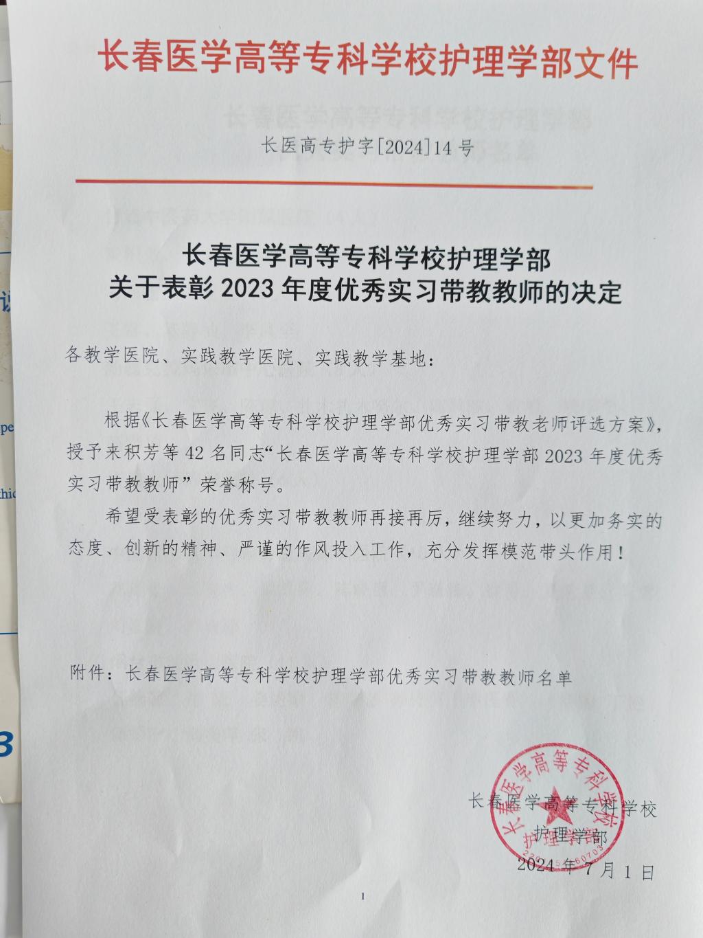 关于表彰2023年度优秀实习带教教师的决定